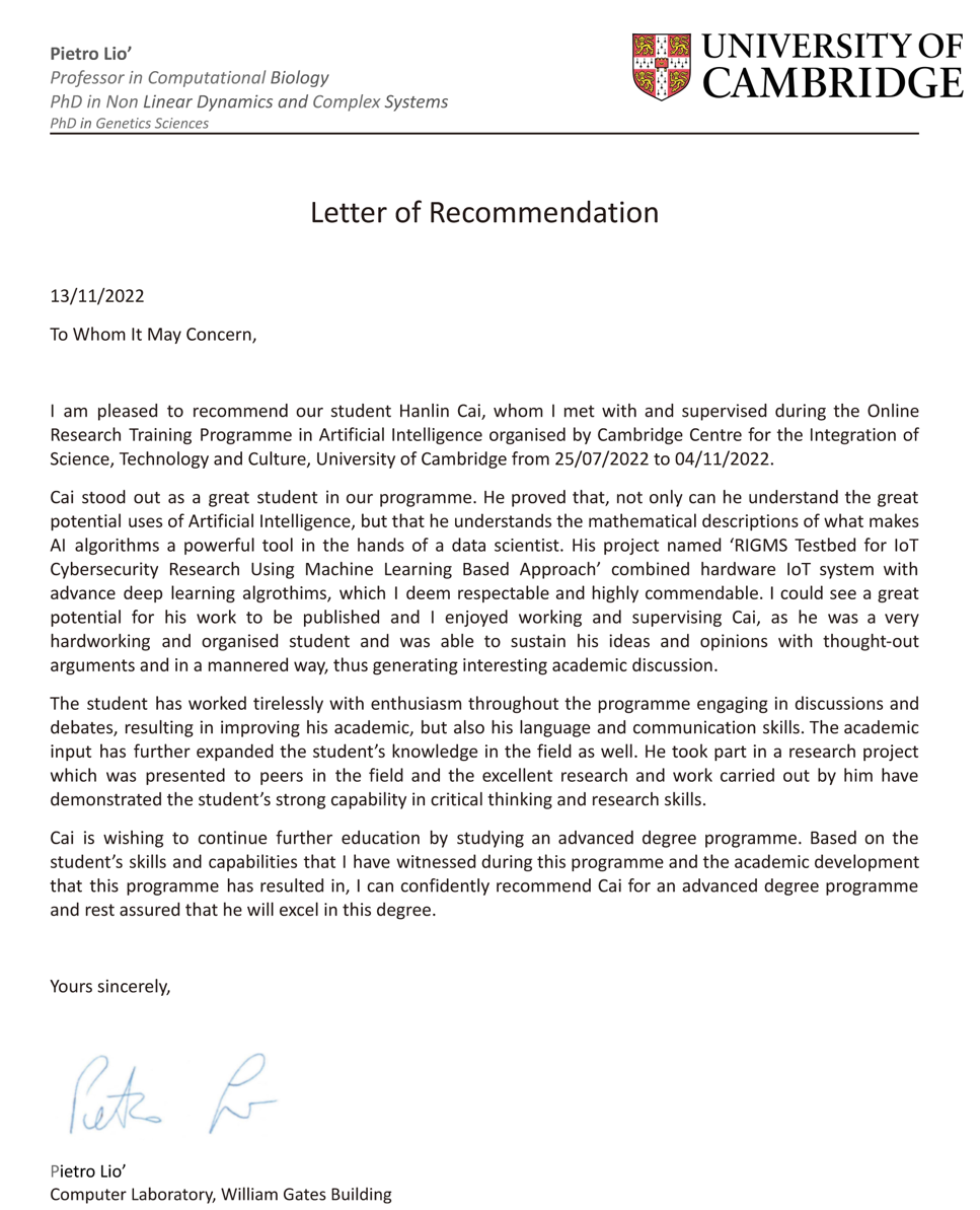 但就像同项目的朋友(wyc)在知乎上吐槽的,教授的英文口音确实是一言难尽,三节AI正课几乎听不懂——当然,一方面确实是口音的问题,但更多的是ML (机器学习) 经历的欠缺。不过,至少这次暑研在比较感兴趣的 ML+IIoT 领域,做了比较深入的文献综述,最后产出的 Research Proposal 和 Final Report 在大三下的实习学期也给我带来了很大的便利。